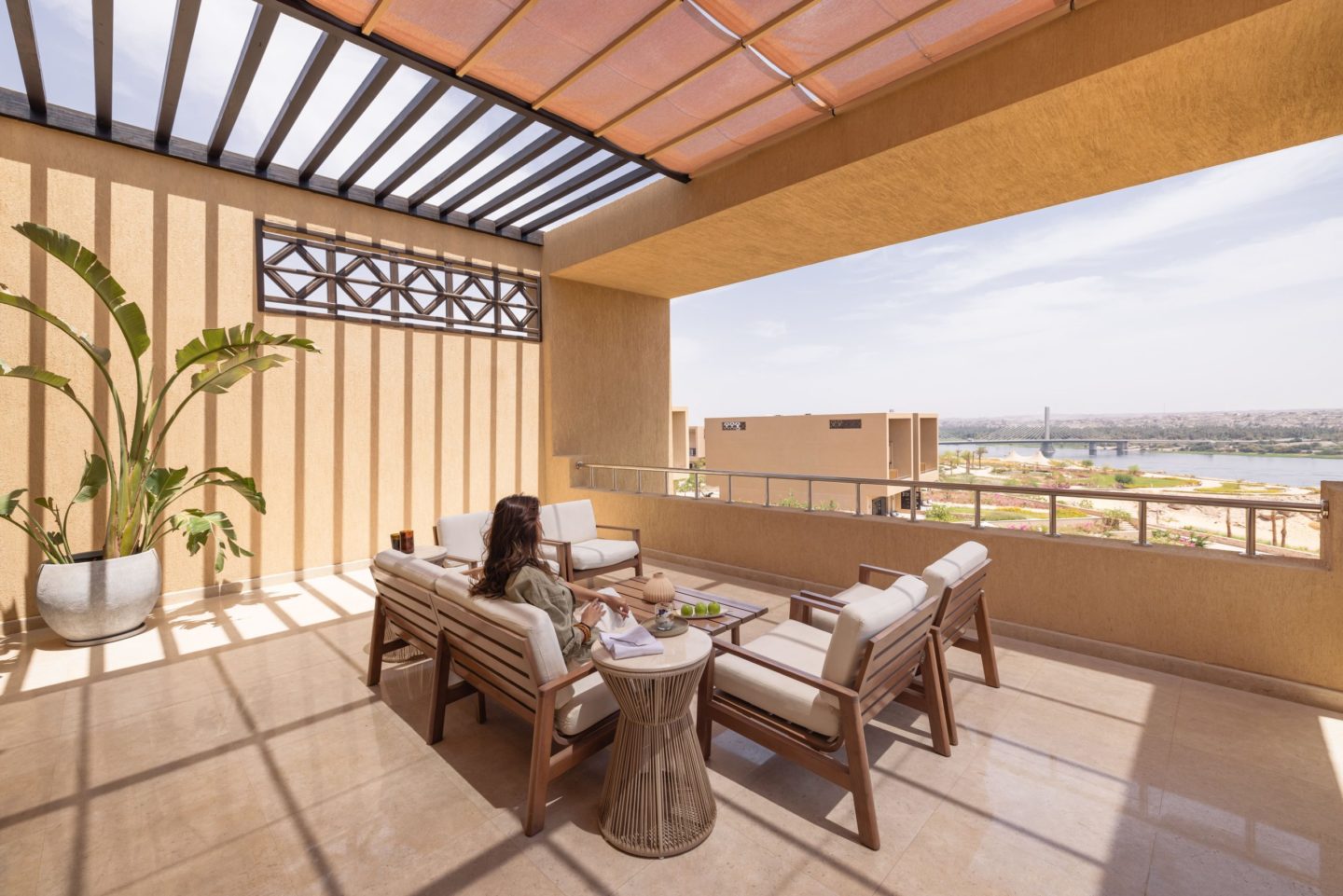 Superior 33sqm ensuite room with two queen-size beds, deluxe 38sqm ensuite room with king-size bed – both of which have captivating Nile River balcony view. The third room features a king-size bed with a garden-view balcony and is adjoined by a children’s sitting room, furnished with a desk, chair, and a cushioned lounging pouf.